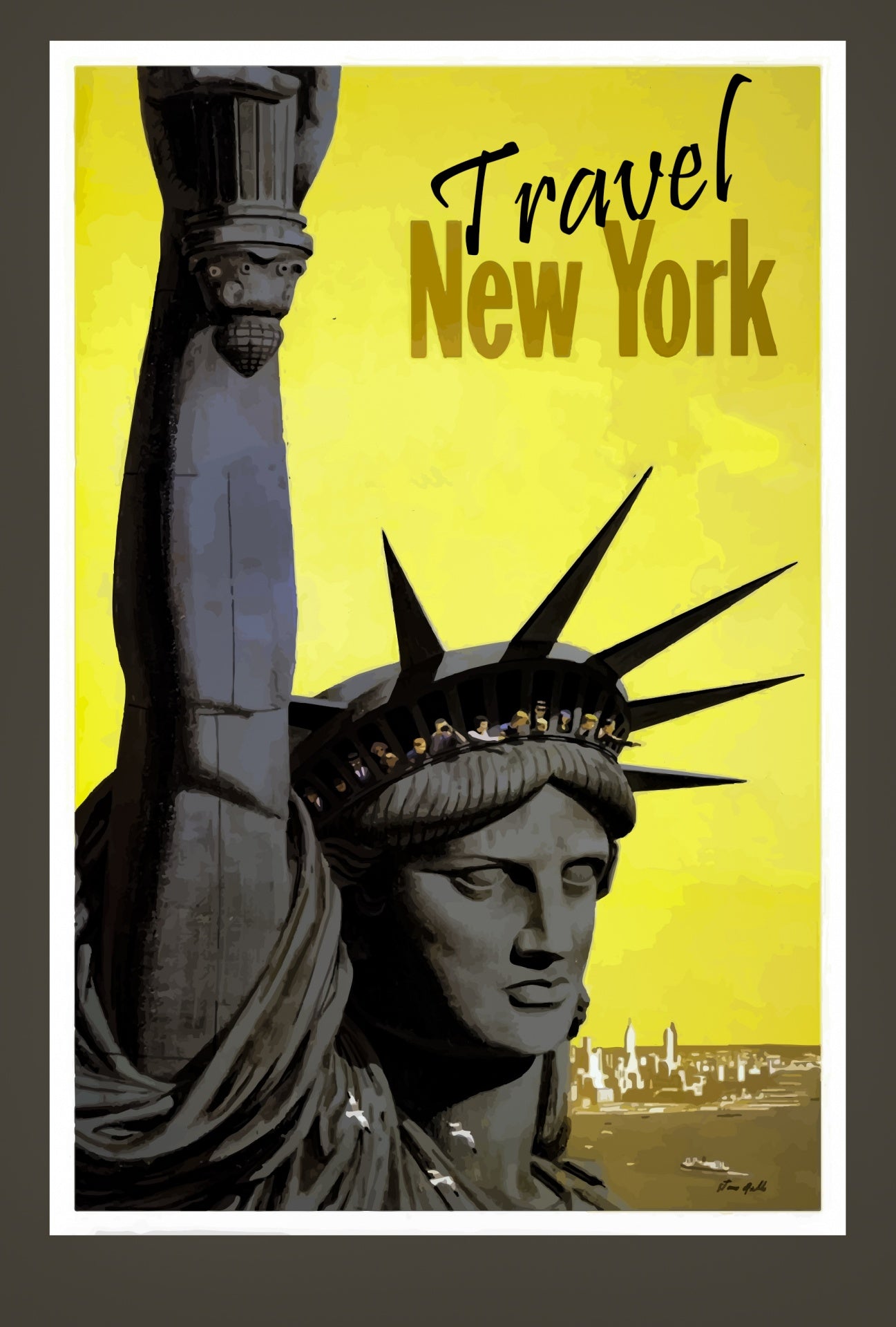 Illustration d'une affiche ancienne de voyage pour New York , représentant la tête de la statue de la liberté sur fond jaune. Voilà une très jolie plaque décorative en métal, qui sera du plus bel effet dans votre intérieur. Percée à chaque extrémité pour en faciliter l'installation sur votre mur, vous pouvez choisir une version non percée plus fine, en aluminium, à insérer dans un cadre.